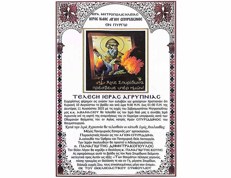 Πρόγραμμα Σεβ. Μητροπολίτου Ἠλείας κ.ΑΘΑΝΑΣΙΟΥ Στίς Παρακλήσεις τοῦ 15αυγούστου 2025