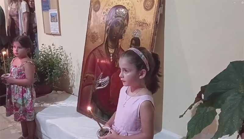 Τα μάτια όλων στρέφονται στο εσωτερικού του Ναού . Η Πάνσεπτη Θαυματουργική Εικόνα της Παναγίας, βασταζόμενη στα χέρια προσκυνητών, «βηματίζει» προς την πόρτα.