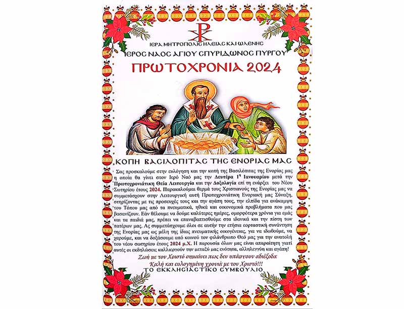 Εκ της Ιεράς Μητροπόλεως Ηλείας ανακοινούται ότι την 1η του μηνός Ιανουαρίου 2024, η Ιερά Μητρόπολις Ηλείας θα κόψη την Πρωτοχρονιάτικη πίτα εις τα Γραφεία της Ιεράς Μητροπόλεως
