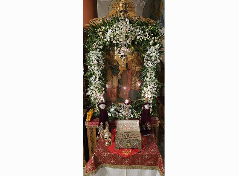 Κάνουμε γνωστόν εις τους ευλαβείς και φιλάγιους Χριστιανούς μας ότι τα Ιερά Λείψανα των Αγίων Αναργύρων Κοσμά και Δαμιανού, καθώς επίσης και αποτμήματα λειψάνων άλλων Αγίων της Εκκλησίας μας ήτοι: (Τιμίου Προδρόμου, Αγίων Παντελεήμονος, Τρύφωνος, Ερμογένους, Αικατερίνης, Παρασκευής και των Θεοπατόρων Ιωακείμ και Άννης), τα οποία μεταφέρθησαν με την έγκριση του Σεπτού μας Ποιμενάρχου κ.κ. Αθανασίου, από τον Ιερό Ναό Αγίου Νικολάου Δούκα Ηλείας, προς ευλογία και αγιασμό των Χριστιανών μας, θα τεθούν για προσκύνηση και κατά την αυριανή Αναστάσιμη Θεία Λειτουργία Κυριακή 5η Νοεμβρίου.