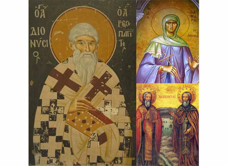 3 Οκτωβρίου - Άγιος Διονύσιος ο Αρεοπαγίτης, Αγία Δάμαρις η Αθηναία, Όσιος Ιωάννης ο Χοζεβίτης επίσκοπος Καισαρείας, Άγιοι Ρουστίκος και Ελευθέριος, Άγιος Θεόκτιστος, Άγιος Διονύσιος Ιερομάρτυρας και οι μαρτυρήσαντες μαζί μ' αυτόν Φαύστος, Γάιος, Πέτρος, Παύλος, Ευσέβιος, Χαιρήμων και άλλοι δύο μάρτυρες, Άγιος Θεαγένης, Άγιος Θεότεκνος και Όσιος Διονύσιος ο Έγκλειστος «εν τω Σπηλαίω»