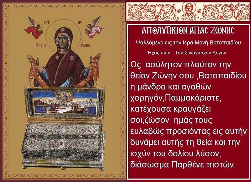Ω Ζώνη σεπτή, που περικυκλώνεις και φρουρείς τη πόλη και τον λαό σου και τον διασώζεις από κάθε βαρβαρική επιδρομή.