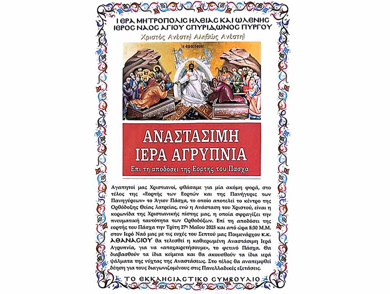 Τρίτη 27 Μαΐου Ιερά Αγρυπνία στον Ι. Ν. Αγίου Σπυρίδωνος Πύργου για την Απόδοση του Πάσχα