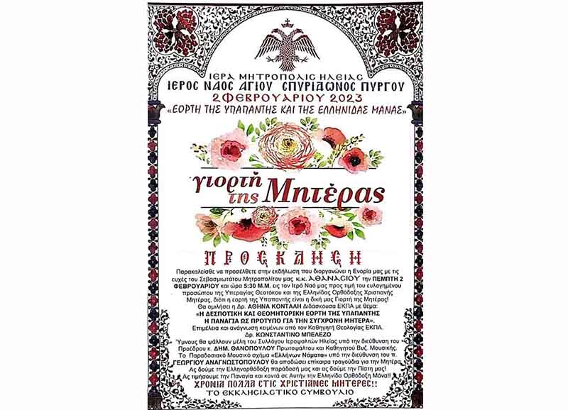 Εκδήλωση για την εορτή της Μητέρας 2 Φεβρουαρίου, στον Ι.Ν. Αγ. Σπυρίδωνος Πύργου