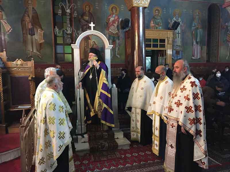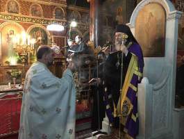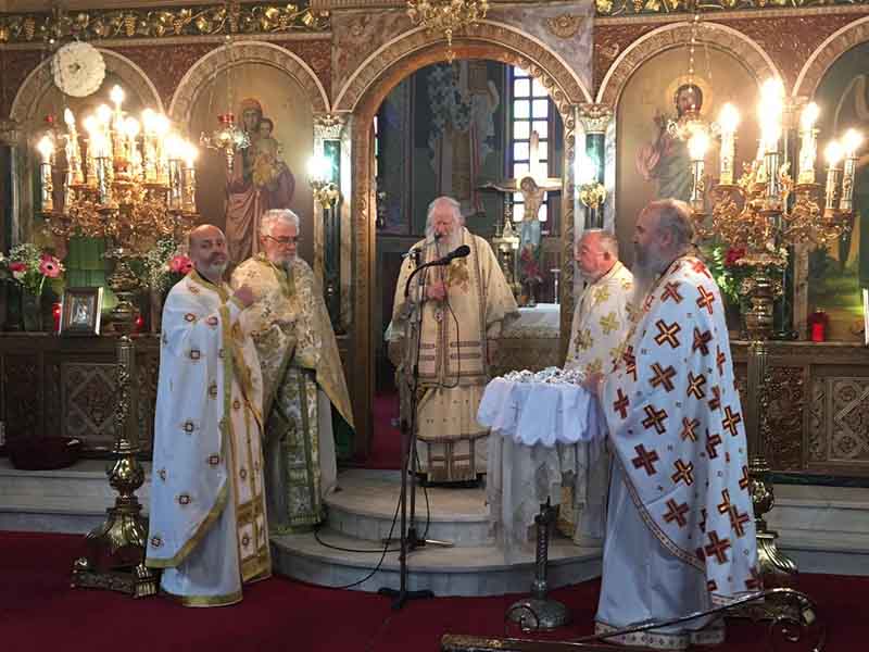 χοροστάτησε ο εξ Ηλείας καταγόμενος Θεοφιλέστατος Επίσκοπος Ανδρούσης κ.κ. Κωνστάντιος, συνεπικουρούμενος από τους Αιδ. π. Παναγιώτη Γιατρά, π. Κωνσταντίνο Βαβίλη, π. Νικόλαο Κατσηδήμα, π. Βλάσιο Μπενέτο, π. Διονύσιο Θεοδόση και τον Προϊστάμενο του Ιερού Ναού π. Κωνσταντίνο Συριόπουλο, ευλογώντας επίσης τους προσφερθέντες άρτους και ομιλώντας για τον εορταζόμενο μάρτυρα Τρύφων απευθυνόμενος θεσπέσια στα μέλη του εκκλησιάσματος, ενώ πατρικώς και εγκαρδίως ευχήθηκε χρόνια πολλά σε όλους, ευχαριστώντας παράλληλα και τον Σεβασμιώτατο Μητροπολίτη μας, που του παρείχε ευγενικά και φιλαδελφικά όπως πάντα αυτή την ωραία πνευματική ευκαιρία.