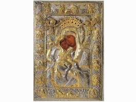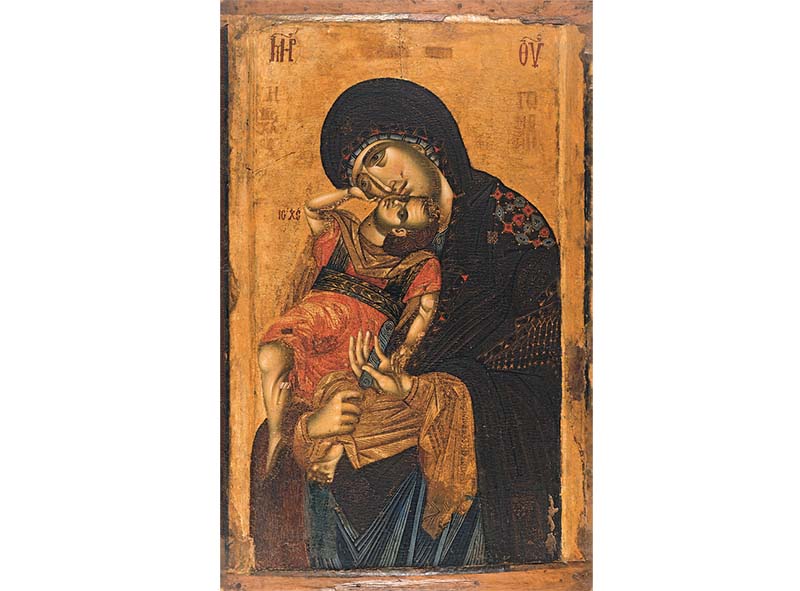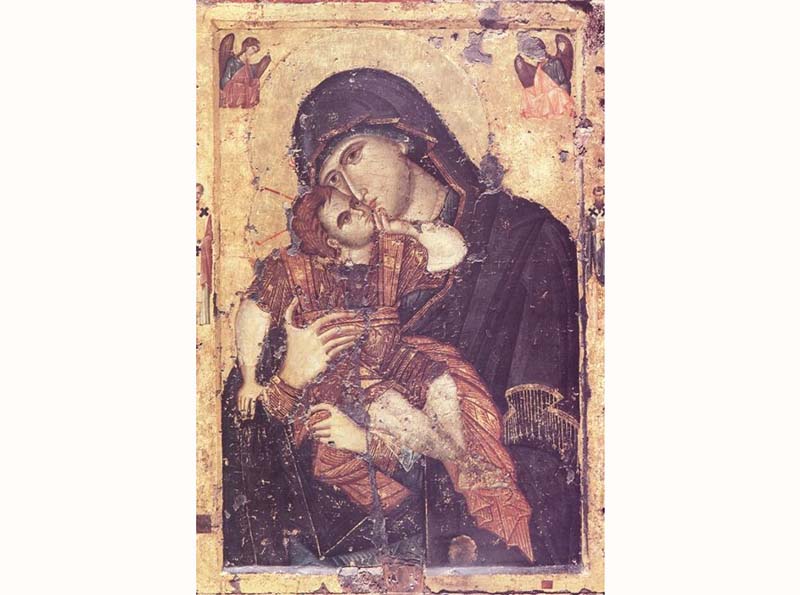 Στὸ χρυσὸ βάθος τῆς εἰκόνος ἀναγράφονται οἱ συντομογραφίες «Μ(Η)ΤΗΡ Θ(ΕΟ)Υ» καὶ ἡ ἐπιγραφὴ «Η ΚΕΧΑΡΙΤΩΜΕΝΗ». Ἡ ἀντίθεση ἀνάμεσα στὴ ζωηρὴ στάση τοῦ Χριστοῦ καὶ στὴ μελαγχολικὴ ἔκφραση τῆς Παναγίας παραπέμπει στὸ μελλοντικὸ Πάθος τοῦ Κυρίου.