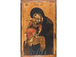 Ἡ Παναγία κρατᾶ στὴν ἀγκαλιά της τὸν Χριστό, εἰκονιζόμενο ἀπὸ τὴν πλάτη νὰ παίζει μὲ τὴ Μητέρα Του χαϊδεύοντας μὲ τὸ δεξί Του χέρι τὸ πρόσωπό της. Ἡ Παναγία ἀσπάζεται τρυφερὰ τὸ πρόσωπο τοῦ Χριστοῦ ἐκδηλώνουσα τὴ μητρική της στοργή, καὶ κρατάει μὲ τὸ ἕνα της χέρι τὸ πόδι Του, καὶ μὲ τὸ ἄλλο κλειστὸ εἰλητάριο.