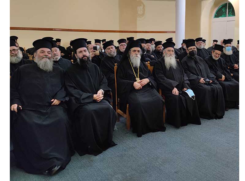 Μετά το κέρασμα από το Εκκλησιαστικό Συμβούλιο του Ιερού Ναού, ακολούθησε στην παρακείμενη αίθουσα της Αποστολικής Διακονίας, η Ιερατική Σύναξη κατά την οποία ο πολιός μας Ιεράρχης πρώην Ηλείας κ.κ. Γερμανός ευχόμενος για μία ακόμη φορά τα δέοντα στον νέο μας Ποιμενάρχη, απηύθυνε πνευματικές νουθεσίες και συμβουλές με τον εύληπτο, πρακτικό και βιωματικό λόγο του, μέσα από την μακρόχρονη, ευδόκιμη αλλά και Θεάρεστη ποιμαντορία του, συνιστώντας τον σεβασμό και την υπακοή των Κληρικών