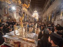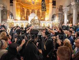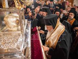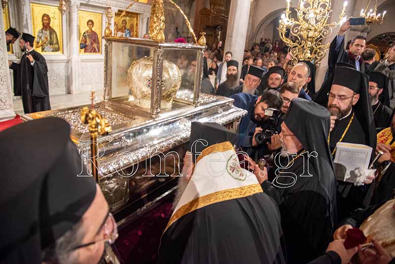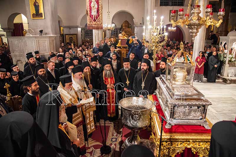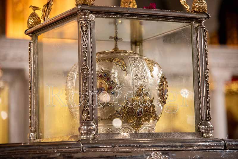 Συγκινητική ήταν η στιγμή όταν ο Σεβ. κ. Βαρνάβας ξεκλείδωσε την Λάρνακα του Μεγαλομάρτυρος και το μύρο του Αγίου ευωδίασε θαυμαστώς τον ασφυκτικά γεμάτο από κόσμο Ιερό Ναό με τους πιστούς να παρακολουθούν με δέος και ευλάβεια την Τελετή και να περιμένουν με υπομονή για να λάβουν το μύρο.