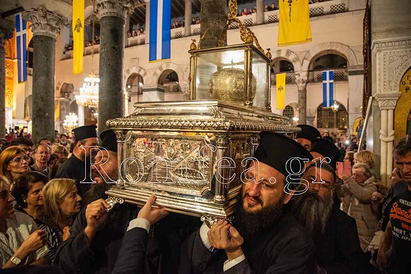 Με βυζαντινή μεγαλοπρέπεια, όπως αρμόζει στην αγιοτόκο Θεσσαλονίκη, ολοκληρώθηκαν οι λατρευτικές και εορταστικές εκδηλώσεις του Πολιούχου της, Μεγαλομάρτυρος Αγίου Δημητρίου του Μυροβλύτου, το απόγευμα της Κυριακής 5 Νοεμβρίου 2023, με την τελετή του καθαγιασμού του Αγίου Μύρου του.