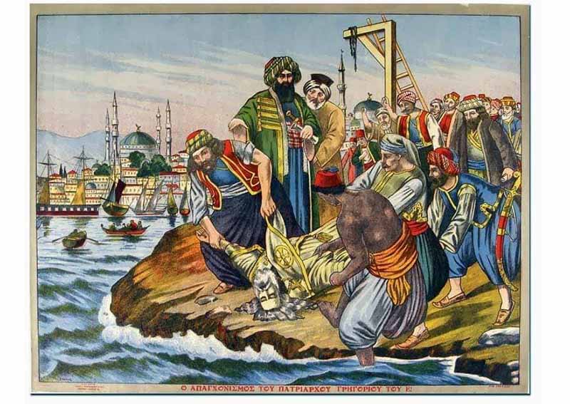 Ο Γρηγόριος ο Ε’, ο φλογερός αυτός Ιεράρχης, ακολούθησε τον δρόμο του. Σάρκωσε ολόκληρο το υπόδουλο Γένος. Επωμίσθηκε το σταυρό του. Ανέβηκε το Γολγοθά του. Δέχθηκε ραπίσματα, χλευασμούς, εμπτυσμούς και τέλος τον θάνατο με απαγχονισμό. Μπροστά στο Πατριαρχείο, την ημέρα του Πάσχα του 1821, οι Τούρκοι κρέμασαν τον Πατριάρχη. Στο έγγραφο της καταδίκης του (τουρκιστί «γιαφτάς»), αναφέρεται η αιτία του απαγχονισμού του: «.…Αλλ’ ο άπιστος Πατριάρχης των Ελλήνων… εξ αιτίας τής διαφθοράς τής καρδίας του, όχι μόνον δέν ειδοποίησεν ουδ’ επαίδευσε τούς απατηθέντας, αλλά καθ’ όλα τά φαινόμενα ήτο καί αυτός, ως αρχηγός, μυστικός συμμέτοχος τής Επαναστάσεως… αντί νά δαμάση τούς αποστάτας καί δώση πρώτος τό παράδειγμα τής εις τά καθήκοντα επιστροφής τών, ο άπιστος ούτος έγινεν ο πρωταίτιος όλων τών ανεφυεισών ταραχών. Είμεθα πληροφορημένοι ότι εγεννήθη εν Πελοποννήσω καί ότι είναι συνένοχος όλως τών αταξιών, όσας οι αποπλανηθέντες ραγιάδες έπραξαν κατά τήν επαρχίαν Καλαβρύτων… Επειδή πανταχόθεν εβεβαιώθημεν περί τής προδοσίας του όχι μόνος εις βλάβην τής υψηλής Πύλης, αλλά καί εις όλεθρον αυτού τού έθνους του, ανάγκη ήτο νά λείψη ο άνθρωπος ούτος από τού προσώπου τής γής καί διά τούτο εκρεμάσθη πρός σωφρονισμό τών άλλων».
