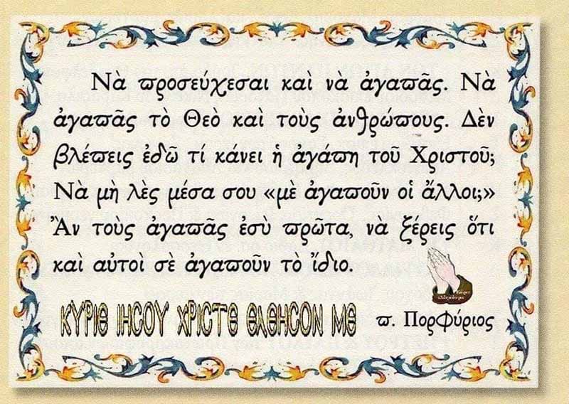 "Ένας Άγιος των ημερών μας! Ο Άγιος που μας φωνάζει ότι ο σκοπός της ζωής είναι να αγιάσεις. Ούτε να πλουτίσεις, ούτε να εξουσιάσεις, ούτε να καταπιέσεις. Εν Χριστώ ο πλούτος σου είναι περιττός. Εν Χριστώ αισθάνεσαι και είσαι ελεύθερος και δεν δέχεται η ψυχή την πίεση του κόσμου, άσχετα αν πονά για τα του κόσμου. Ο Άγιος Πορφύριος μας φωνάζει την ημέρα της μνήμης του ότι μπορείς να αγιάσεις στο κέντρο της Αθήνας, στην Ομόνοια που την έλεγε αγιότοπο. Να αγιάσεις μέσα στη φασαρία της. Να αγιάσεις στο τροχόσπιτο στο Μήλεσι με όλα τα αυτοσχέδια της απέριττης οσιακής ζωής. Να αγιάσεις λέγοντας την ευχή και όχι το παραλήρημα του μισόκαλου. Να αγιάσεις πιστεύοντας, ομολογώντας και προσδοκώντας την μόνη αλήθεια, αυτή της Αναστάσεως. Ο Άγιος βοήθεια μας!"
