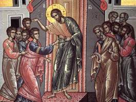 ‘’Ούσης οψίας τη ημέρα εκείνη τη μια των Σαββάτων, και των θυρών κεκλεισμένων, όπου ήσαν οι Μαθηταί συνηγμένοι δια τον φόβον των Ιουδαίων, ήλθεν ο Ιησούς και έστη εις το μέσον και λέγει αυτοίς, Ειρήνη υμίν… Θωμάς δε, εις εκ των Δώδεκα, ο λεγόμενος Δίδυμος, ουκ ήν μετ’ αυτών,ότε ήλθεν ο Ιησούς. Έλεγον ουν αυτώ οι άλλοι Μαθηταί. Εωράκαμεν τον Κύριον. Ο δε είπεν αυτοίς. Εάν μη ίδω εν ταις χερσίν αυτού τον τύπον των ήλων ,και βάλω τον δάκτυλον μου εις τον τύπον των ήλων και βάλω την χείρα μου εις την πλευράν αυτού, ου μη πιστεύσω. Και μεθ’ ημέρας οκτώ πάλιν ήσαν έσω οι Μαθηταί αυτού, και Θωμάς μετ’ αυτών. Έρχεται ο Ιησούς, των θυρών κεκλεισμένων και έστη εις το μέσον, και είπεν. Ειρήνη υμίν. Είτα λέγει τω Θωμά. Φέρε τον δάκτυλον σου ώδε, και είδε τας χείρας μου και φέρε την χείρα σου, και βάλε εις την πλευράν μου και μη γίνου άπιστος, αλλά πιστός και απεκρίθη ο Θωμάς και είπεν αυτώ ,ο Κύριος μου και ο Θεός μου…’’