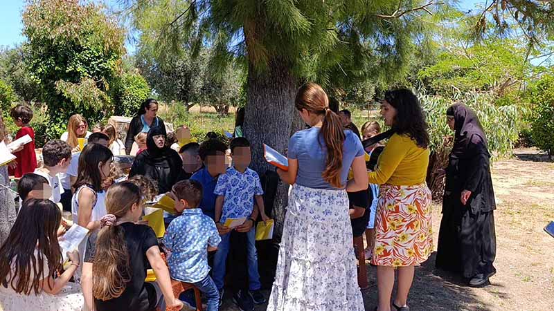 Με την απέραντη αγάπη της για τα «παιδάκια» της γνώμονα και με μια αγκαλιά ζεστή και τεράστια, η Οσιοτάτη Καθηγουμένη της Μονής Σκαφιδιάς, Μοναχή Μακαρία Β, οραματίστηκε και πραγματοποίησε την τέλεια λήξη μια τέλειας χρονιάς του κατηχητικού της Μονής.