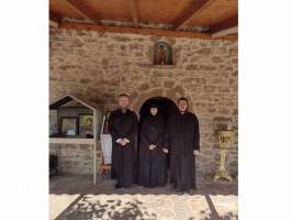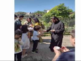 Τελευταία στάση η Ιερά Μονή Κοιμήσεως της Θεοτόκου στο Κρυονέρι Αμαλιάδας, όπου ο Πατέρας Γερμανός άνοιξε της «αγκαλιά» του μοναστηριού αλλά και την δική του για να δεχτεί και να φιλοξενήσει μικρούς και μεγάλους. Τα κεράσματα πλούσια, όλα από τα χέρια του ετοιμασμένα. Καφέδες και χυμοί για να ξαποστάσουν οι μεγάλοι, λαχταριστό παγωτό για να δροσιστούν οι μικροί. Κι όταν τα χεράκια δροσίστηκα και αναπαύτηκαν, απλώθηκαν να πάρουν τα ενθύμια και τις ευλογίες τόσο από την «κυρία» τους, Γερόντισσα Μακαρία όσο και από τον Πατέρα Γερμανό.