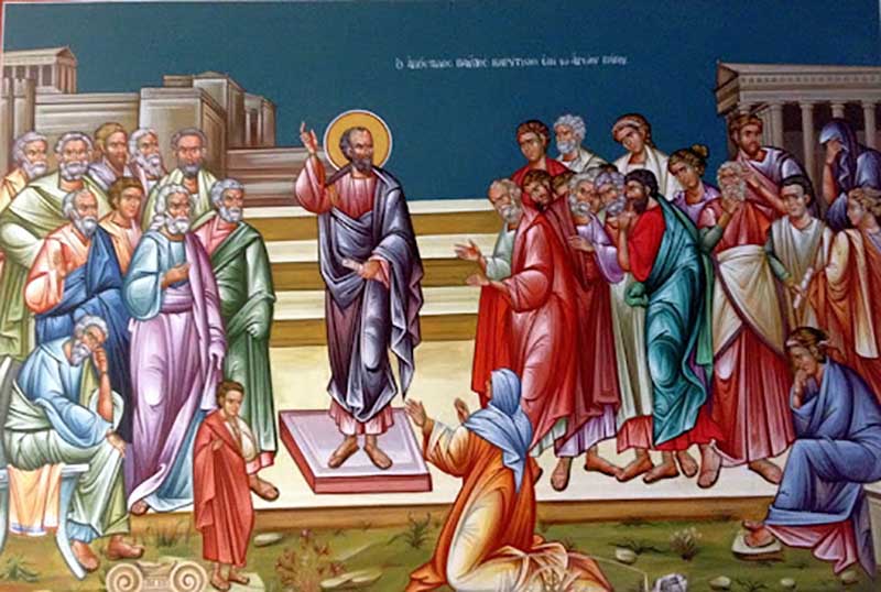 Ο Παύλος, περιδιαβαίνοντας την πανέμορφη Αθήνα, ένιωσε ένα αδιόρατο συναίσθημα δυσφορίας, καθώς έβλεπε και αντιμετώπιζε την ειδωλοποίηση των πάντων. Δεν έχανε, όμως, την ευκαιρία να συζητεί με τους Ιουδαίους, τους Στωικούς και τους Επικούρειους οι οποίοι ειρωνευόντουσαν το λόγο του και μιλούσαν για τα υπ’ αυτού εισαγόμενα καινά δαιμόνια. Παρόλα αυτά, όμως, επειδή επρόκειτο για ανθρώπους με πνευματικές ανησυχίες και με συνεχή διάθεση μαθητείας, δε δίστασαν να τον ανεβάσουν στον Άρειο Πάγο, προκειμένου ν’ ακούσουν τη νέα διδασκαλία. Και ο Παύλος βρήκε την ευκαιρία να εκφωνήσει τη σημαντικότερη, ίσως, ομιλία του, που έγινε αφορμή να σπαρεί ο λόγος του Θεού στην καρδιά της Αθήνας και να δημιουργηθεί η πρώτη μαγιά, χάριν της οποίας το μήνυμα του Ευαγγελίου κατακυρίευσε τα πάντα, ανέδειξε και καταξίωσε το Ελληνικό πνεύμα.