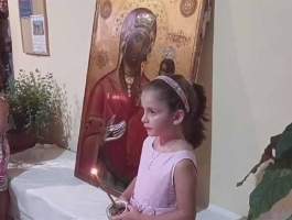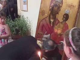 Η Ιερή Εικόνα τοποθετείται δίπλα από την είσοδο, επάνω σε πάλλευκο κεντητό σεντόνι. Κεράκια ανάβουν και η παράκληση «Θεοτόκε Παρθένε, σώσον ημάς» ακούγεται από τα χείλη όλων.
