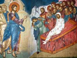 ‘’…Μη κλαίε. Και προσελθών ήψατο της σορού, οι δε βαστάζοντες έστησαν, και είπε. Νεανίσκε, σοι λέγω, εγέρθητι. Και ανεκάθισεν ο νεκρός, και ήρξατο λαλείν και έδωκεν αυτόν τη μητρί αυτού…’’