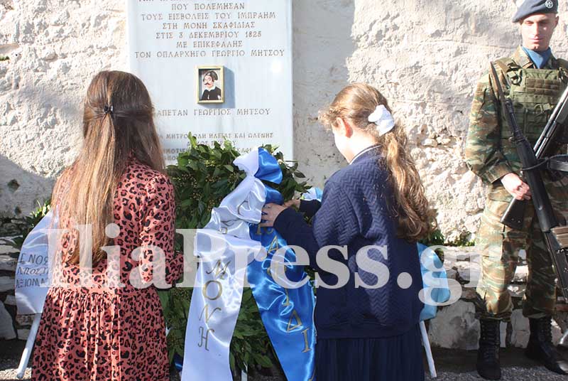 Κορυφαία στιγμή αποτέλεσαν τα αποκαλυπτήρια του νέου μνημείου, αφιερωμένου σε όσους ύψωσαν το ανάστημά τους στη μάχη της Σκαφιδιάς. Η σεμνή αλλά επιβλητική πλάκα αποκαλύφθηκε μπροστά στο εκκλησίασμα, που τίμησε τη στιγμή με απόλυτη σιωπή. Λίγα λεπτά πριν ο Μητροπολίτης Ηλείας και οι ιερείς είχαν τελέσει επιμνημόσυνη δέηση για την ανάπαυση των ηρώων της μάχης.