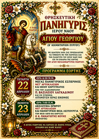 Με Πνευματική χαρά και Εκκλησιαστική κατάνυξη, καλούνται οι ευσεβείς και φιλέορτοι Χριστιανοί, να συμμετάσχουν στις Ιερές Ακολουθίες της Πανηγύρεως, έτσι ώστε όλοι μαζί να τιμήσουμε τον Άγιο Γεώργιο και να δοξάσουμε τον Αναστάντα Κύριο.