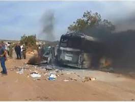Σύμφωνα με μία ακόμα μαρτυρία, η ελληνική αποστολή (το κοντέινερ με τη βοήθεια, ένα καινούργιο λεωφορείο με τα μέλη της αποστολής και δύο οχήματα του στρατού για συνοδεία) μόλις έφθασε στη Λιβύη, αναγκάστηκε να περάσει μέσα από βουνά και χωριά για να φθάσει στην πόλη Ντέρνα καθώς η εθνική οδός στη Λιβύη είναι κατεστραμένη από τις πλημμύρες. Ενώ διερχόταν από το χωριό Μαράουα, γύρω στις 2:30 το μεσημέρι ένα αυτοκίνητο στο οποίο επέβαινε μια οικογένεια από τη Λιβύη έτρεχε στο αντίθετο ρεύμα με αποτέλεσμα να συγκρουστεί με το λεωφορείο και να εκδηλωθεί πυρκαγιά.