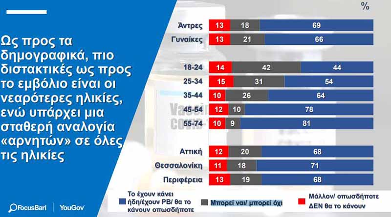 Εντυπωσιακό είναι και το γεγονός ότι οι «αρνητές» σύμφωνα με την Focus Bari, είναι κυρίως νεαρότερης ηλικίας, αλλά και το εύρημα ότι η συντριπτική πλειοψηφία των Ελλήνων κινητοποιήθηκε προκειμένου να εμβολιαστεί τον τελευταίο μήνα, με ένα ποσοστό 62% να δηλώνει ότι εμβολιάστηκε μέσα στον Ιούνιο.