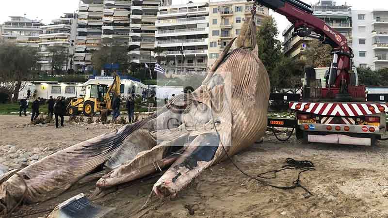 Στην παραλία Φρεαττύδα, στον Πειραιά, ξεβράστηκε μια φάλαινα περίπου οκτώ μέτρων.