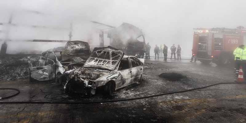 Στο ασύλληπτο τροχαίο δυστύχημα, φορτηγό συγκρούστηκε εν μέσω πυκνής ομίχλης με δύο ΙΧ και έπεσε στον κλωβό των διοδίων, με συνέπεια να ξεσπάσει φωτιά και να απανθρακωθούν οι δύο επιβάτες του δεύτερου αυτοκινήτου, το οποίο συμπιέστηκε από το φορτηγό και το προπορευόμενο όχημα, ενώ τραυματίστηκαν άλλοι τέσσερις.