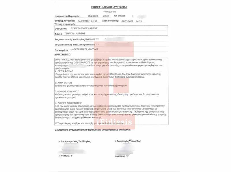 Δύο Ένορκες Διοικητικές Εξετάσεις διέταξε το αρχηγείο της Πυροσβεστικής για τους πλημμελείς χειρισμούς των αρμοδίων υπαλλήλων που ανέλαβαν να κάνουν την αυτοψία στο χώρο της τραγωδίας των Τεμπών.