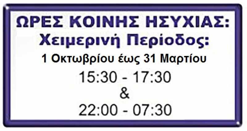 Από τις 15:30 έως τις 17:30 και από τις τις 22:00 έως τις 07:30 οι πολίτες θα πρέπει να προσαρμόζονται στους κανόνες κοινής ησυχίας.