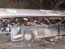 Διώροφο τουριστικό λεωφορείο που μεταφέρει φιλάθλους του ΠΑΟΚ από την Αθήνα στη Θεσσαλονίκη συγκρούεται με διερχόμενο φορτηγάκι που έχει κατεύθυνση προς Λάρισα. Η σύγκρουση σφοδρότατη. Το λεωφορείο πέφτει σε χαράδρα 8 μέτρων. 6 νεκροί. 33 τραυματίες.