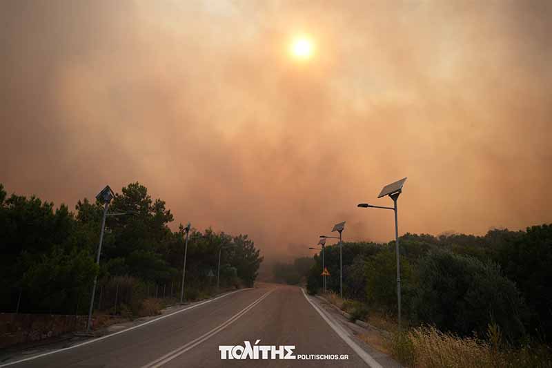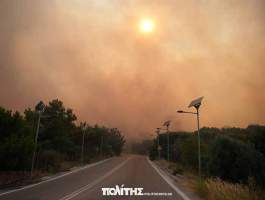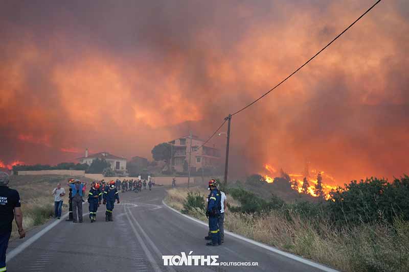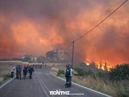 Στο νησί πνέουν ισχυροί άνεμοι, ενώ πυροσβέστες και κάτοικοι δίνουν μάχη για να προστατεύσουν τα σπίτια από τις φλόγες, με την πόλη να «κυκλώνεται» από τις φλόγες.