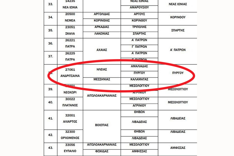 Ο Τ.Κ. 27061 από τις ΔΟΥ Αμαλιάδας, Πύργου και Καλαμάτας θα υπάγεται στη ΔΟΥ Πύργου