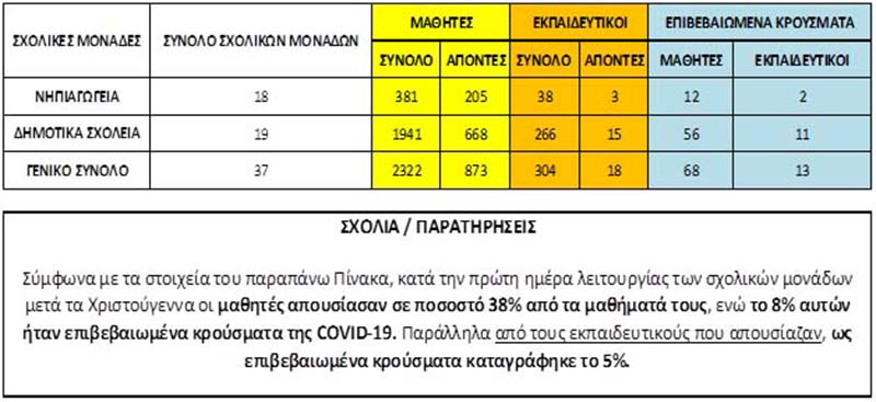 Σύμφωνα με την ενημέρωσή μας από τις σχολικές μονάδες αρμοδιότητάς μας, προκύπτουν τα ακόλουθα στοιχεία σχετικά με τις απουσίες μαθητών και εκπαιδευτικών κατά την πρώτη ημέρα λειτουργίας των σχολείων μετά τις διακοπές των Χριστουγέννων.