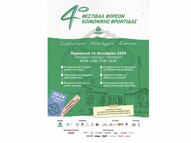 Με τελευταίο σταθμό την Πάτρα, την Παρασκευή 24 Οκτωβρίου 2025, στον Πολυχώρο Πολιτισμού «Ιχθυόσκαλα», κορυφώνεται το 4ο Φεστιβάλ Φορέων Κοινωνικής Φροντίδας της Περιφερειακής Ομοσπονδίας Ατόμων με Αναπηρία Δυτικής Ελλάδας και Νοτίων Ιονίων Νήσων.