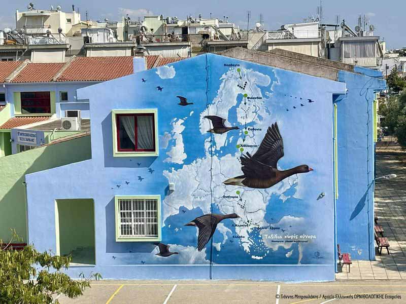 Δύο εντυπωσιακές τοιχογραφίες με πρωταγωνίστρια τη Νανόχηνα, το πιο απειλούμενο υδρόβιο πουλί της Ευρώπης, κοσμούν πλέον τους τοίχους των σχολείων της Αλεξανδρούπολης.