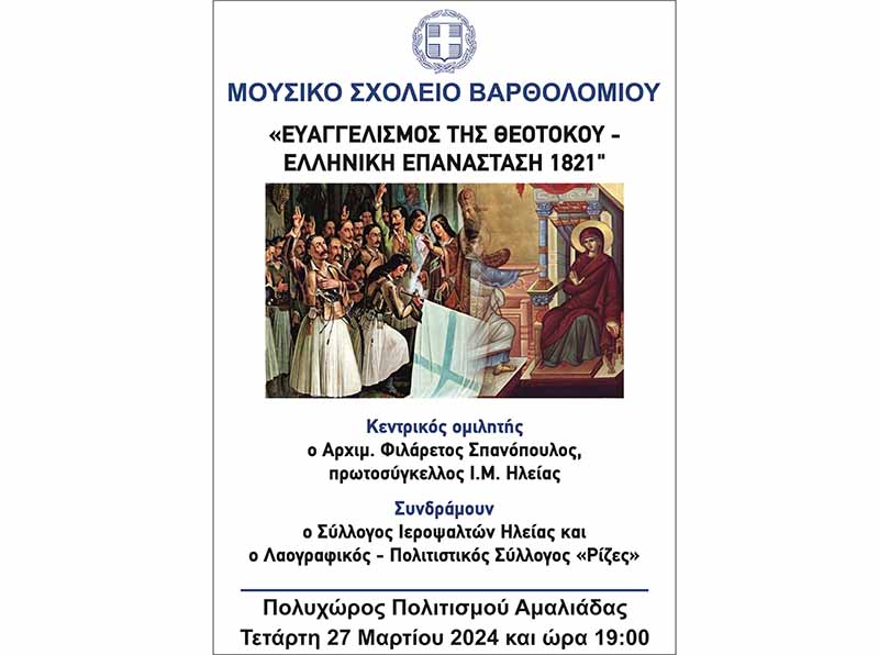 Το Μουσικό Γυμνάσιο με Λ.Τ. Βαρθολομιού, με την υποστήριξη του Δήμου Ήλιδας, σας προσκαλεί στην εκδήλωση για τον διπλό εορτασμό του Ευαγγελισμού της Θεοτόκου και της Ελληνικής Επανάστασης του 1821, την Τετάρτη, 27/03/2024 και ώρα 19:00, στον Πολυχώρο Αμαλιάδας.