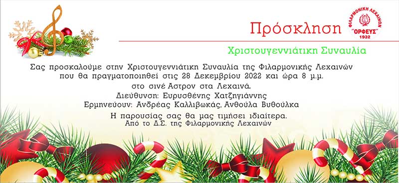 Την Τετάρτη 28 Δεκεμβρίου στις 8μμ στο ΑΣΤΡΟΝ στα Λεχαινά θα γίνει η μεγάλη Χριστουγεννιάτικη συναυλία της Φιλαρμονικής Λεχαινών με τραγούδια των Χριστουγέννων και της Πρωτοχρονιάς αλλά και κλασσικά κομμάτια