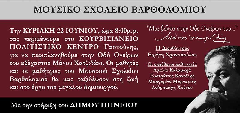 Σας περιμένουμε την Κυριακή 22 Ιουνίου και ώρα 8:00 μμ, στο Κουρβισιάνειο Πολιτιστικό Κέντρο Γαστούνης για να περιπλανηθούμε μαζί, κοινό και παιδιά του Μουσικού Σχολείου Βαρθολομιού, στην Οδό Ονείρων του αξέχαστου Μάνου Χατζιδάκι. Οι μαθητές και οι μαθήτριες του Μουσικού Σχολείου Βαρθολομιού θα μας ταξιδέψουν στη ζωή και στο έργο του μεγάλου δημιουργού.