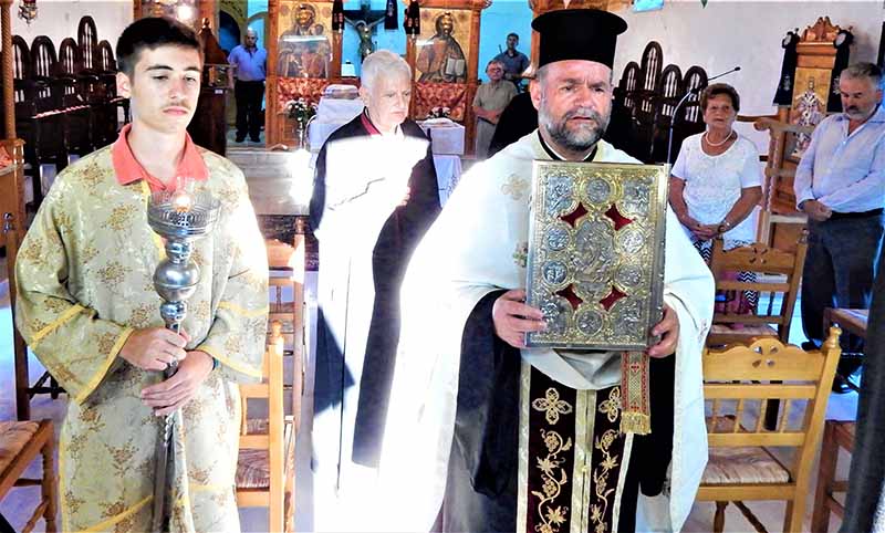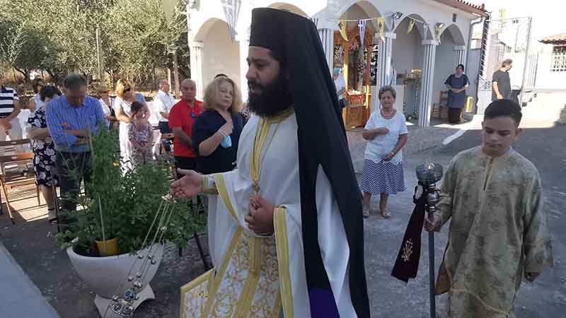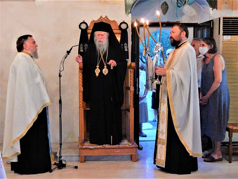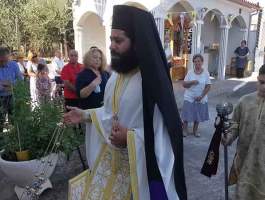 Στον Μέγα Πανηγυρικό Αρχιερατικό Εσπερινό, πλαισιωμένος από τους Αιδεσ. π. Γρηγόριο Πάπαρη, π. Παντελέημων Παπαηλιού και τον οικείο εφημέριο π. Νικόλαο Κατσηδήμα, χοροστάτησε ο Σεβασμιώτατος Μητροπολίτης μας κ.κ. Γερμανός, ο οποίος ευλόγησε τους προσφερθέντες άρτους, ενώ στο κήρυγμά του αναφέρθηκε εκτενώς στο γεγονός της Αποτομής της Τιμίας Κεφαλής του Αγίου Ιωάννου.