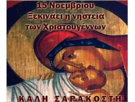 H δεύτερη πιο μακρά περίοδος νηστείας μετά τη Μεγάλη Τεσσαρακοστή είναι η νηστεία των Χριστουγέννων, γνωστή στη γλώσσα του Ορθοδόξου λαού μας και ως Σαραντάμερο. Περιλαμβάνει και αυτή σαράντα ημέρες, όμως δεν έχει την αυστηρότητα της νηστείας της Μεγάλης Τεσσαρακοστής. Αρχίζει την 15η Νοεμβρίου και λήγει την 24η Δεκεμβρίου. Σ’ αυτήν την περίοδο η Αγία μας Εκκλησία καλεί κάθε άνθρωπο ελεύθερα και με απλότητα, λέγοντάς του: «εμείς τώρα νηστεύουμε, αν θες έλα κι εσύ μαζί»!