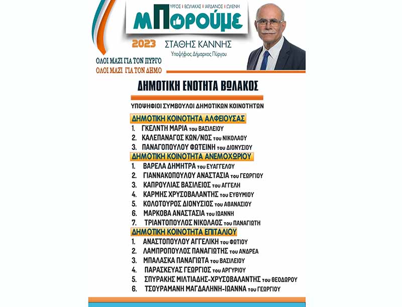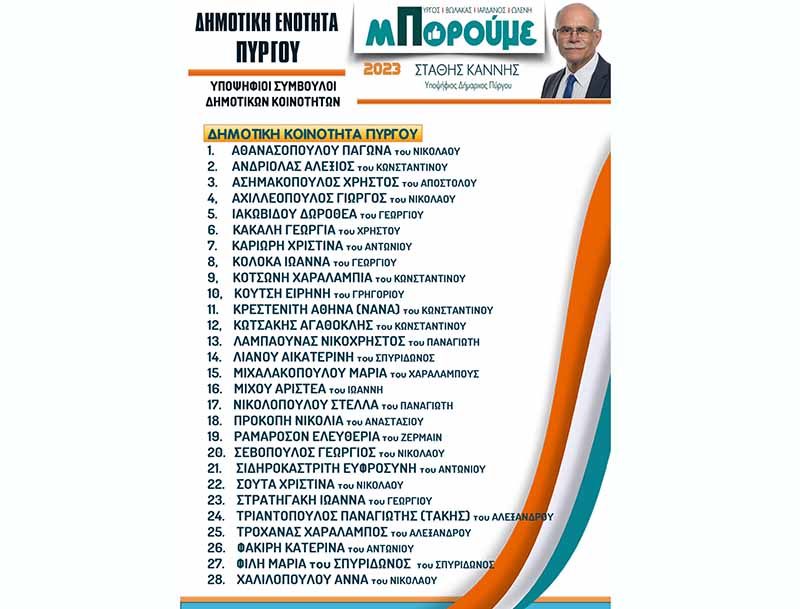 Οι 73 υποψήφιοι Δημοτικοί Σύμβουλοι με την παράταξη "ΜΠΟΡΟΥΜΕ"- Στάθης Καννής στον Δήμο Πύργου