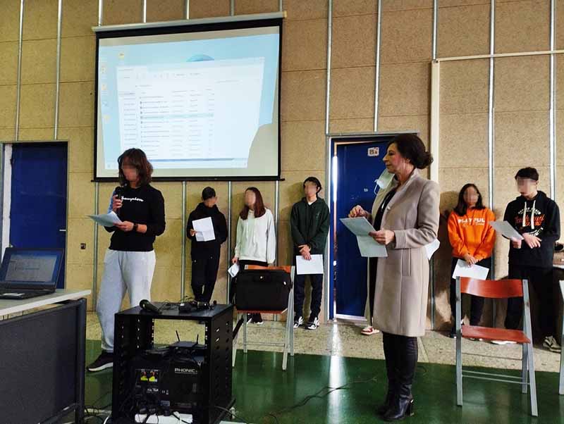 Ακολούθως η κ. Κωνσταντίνα Χέλη, φιλόλογος έκανε μια σύντομη αναφορά στη ζωή και το έργο του Δ. Σολωμού, παρουσίασε τις περιόδους της ελληνικής γλώσσας και ανέδειξε τη διαχρονικότητα και την εξέλιξή της από τον Όμηρο μέχρι σήμερα.