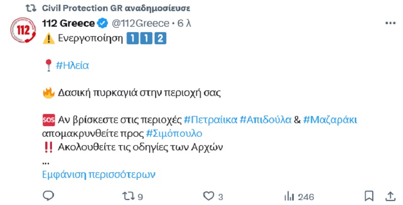 Χωρίς τις αισθήσεις του μεταφέρθηκε στο νοσοκομείο του Πύργου ένας άνδρας που ήταν κοντά στο πύρινο μέτωπο στη Μυρτιά.