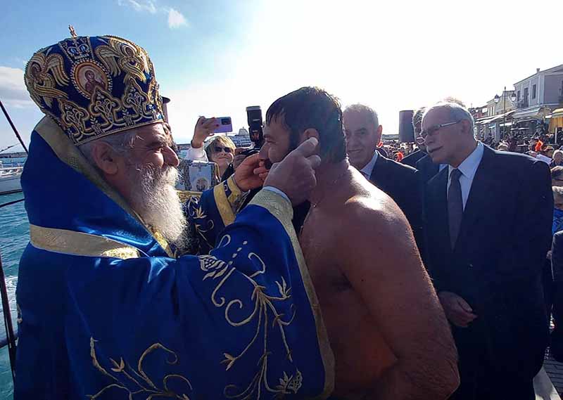 Στις 11 το πρώι οι πιστοί με πομπή κατευθύνθηκαν στη θάλασσα όπου ο Ιερέας έριξε το Σταυρό και αγίασε τα νερά.