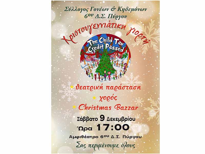 Μια ξεχωριστή Χριστουγεννιάτικη Γιορτή έχει ετοιμάσει και φέτος ο Σύλλογος Γονέων και Κηδεμόνων του 6ου Δημοτικού Σχολείου Πύργου, με ανοιχτή πρόσκληση συμμετοχής, και ελεύθερη είσοδο, για όλα τα παιδιά και τους φίλους του σχολείου, που θέλουν περάσουν ένα απόγευμα γεμάτο με «Χριστούγεννα».