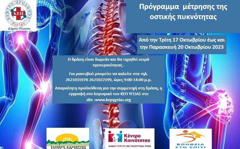 Ο Δήμος Πύργου μέσω του ΚΕΠ Υγείας, θα πραγματοποιήσει δωρεάν πρόγραμμα μέτρησης οστικής πυκνότητας , από την Τρίτη 17/10 έως την Παρασκευή 20/20, στο χώρο της Κοινωνικής Υπηρεσίας του Δήμου (Αγ. Σπυρίδωνος 41)., στο πλαίσιο προγραμμάτων πρόληψης και προαγωγής της υγείας των δημοτών, σε συνεργασία με το Ελληνικό Διαδημοτικό Δίκτυο Υγιών Πόλεων (ΕΔΔΥΠΠΥ).