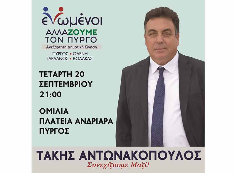 Ομιλία Τάκη Αντωνακόπουλου στην πλατεία Ανδριάρα (Τετάρτη 20/9, ώρα 21.00)