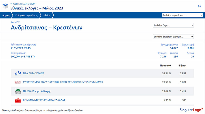 Μέσω τουσυνδέσμου, ή από το πλαϊνό banner, παρακολουθείστε τα αποτελέσματα των εκλογών από το Υπουργείο Εσωτερικών