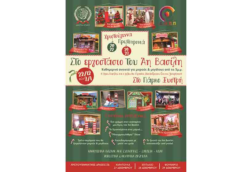 - Ξεκινά η μαγεία των Χριστουγέννων στο «Εργοστάσιο του Αη Βασίλη» την Πέμπτη 22 Δεκεμβρίου 2022 έως και τις 3 Ιανουαρίου 2023